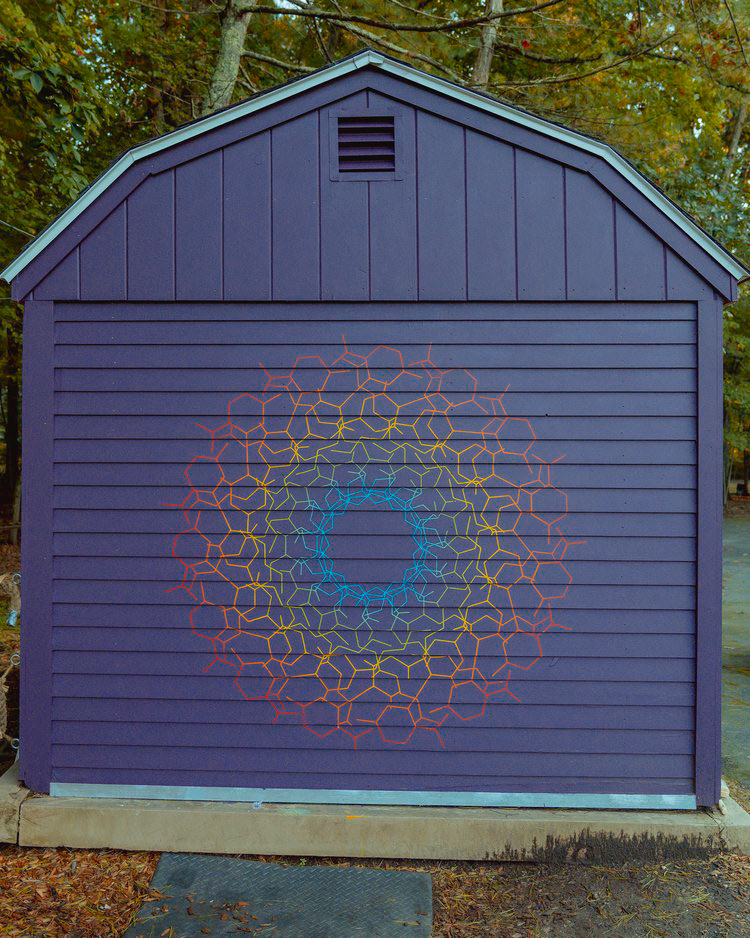 Inner Space is an 8 x 10-foot mural created in collaboration with Windy Village Cooperative. Inspired by the farm’s focus on hemp cultivation and a personal interest in abstracted cosmic imagery, the design incorporates the molecular structures of CBD and CBG, repeated in a radiant, mandala-like pattern. The result merges science and abstraction, grounding the mural in both botanical research and expansive, celestial reference.
