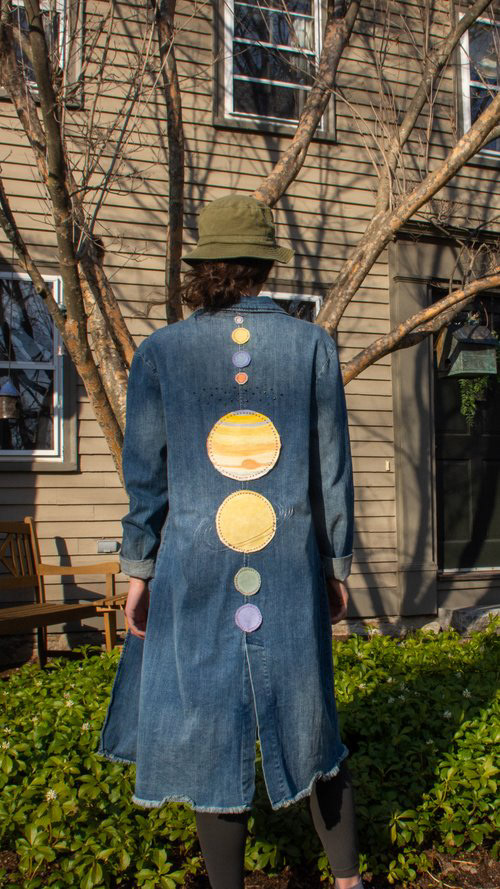 Orbiting the Self was originally created as the capstone project for Sophie’s Bachelor of Science degree, with support from the Atlas Institute, and responds to the gap in fashion-focused wearable technology. The piece reimagines the solar system as an abstract self-portrait, embroidered across the back of a thrifted denim jacket to suggest that the self mirrors the cosmos.